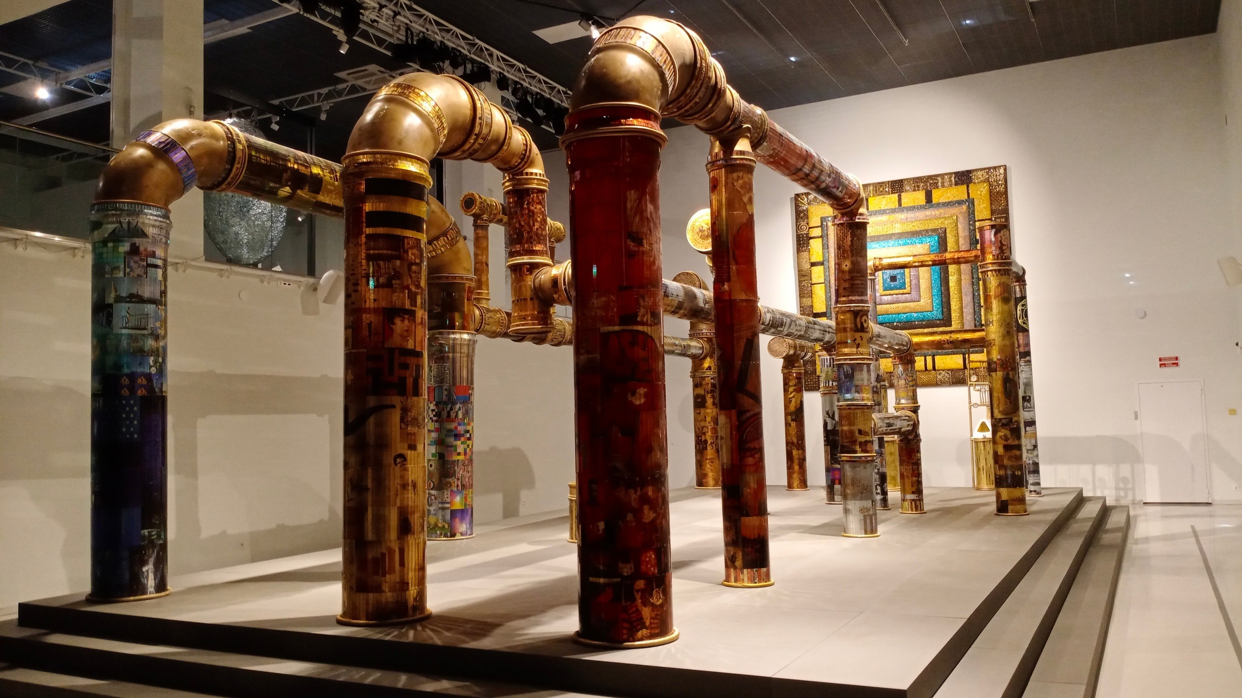 Из райской обители подготовленный посетитель выходил к еще более грандиозному зрелищу – гигантскому арт-объекту «Современная алхимия». Зрелище - величественное: переплетение золоченых инкрустированных труб, которые возвышались до третьего этажа галереи. Внутри арт-объекта, созданного Душаной Бравурой, каждый посетитель невольно ощущал себя частичкой (да хотя бы и пылинкой) таинственного мирового процесса, который превращает самые обычные предметы в мощную энергию искусства.