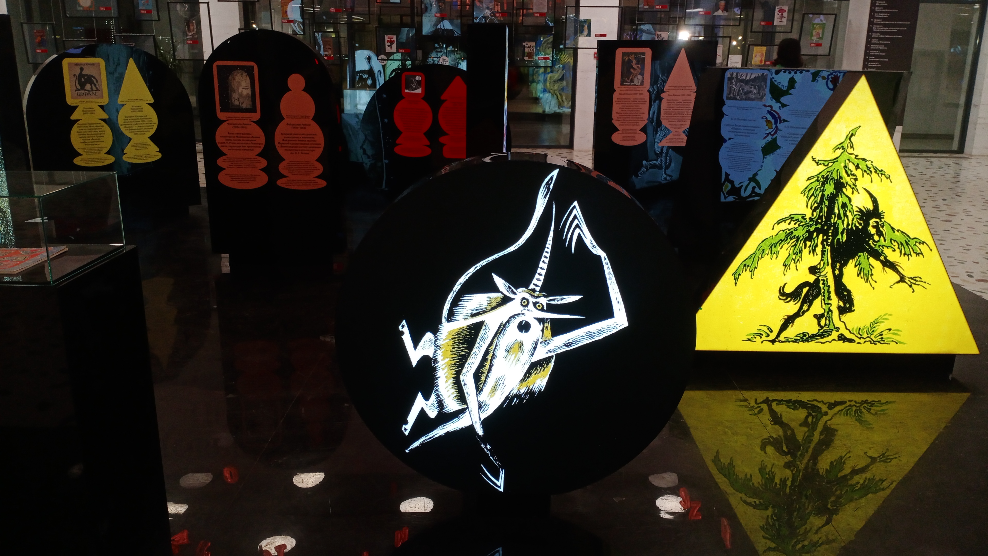 Эта яркая выставка – пример того, как можно нескучно работать с классикой. А еще очень занимательно наблюдать, как сосуществуют реальные люди и сказочные образы. Расположенная на первом этаже в центральном фойе библиотеки экспозиция сразу же привлекает внимание: мимо точно не пройдешь, а подойдешь ближе – «зависнешь».