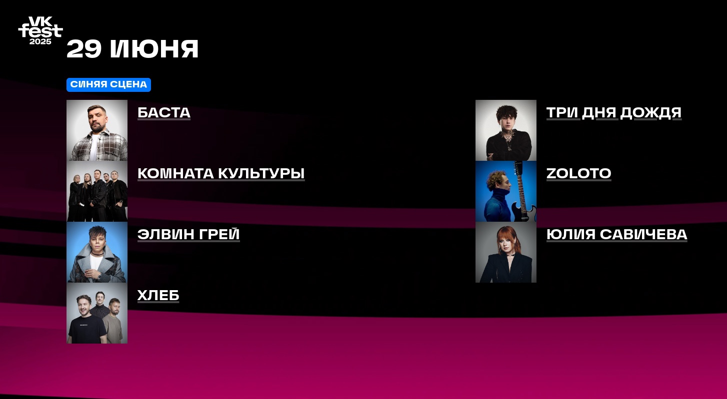На фестивале VK Fest в Казани 29 июня выступят Баста, Юлия Савичева, группы «Комната культуры», «Хлеб», «Три дня дождя», Zoloto, также к ним присоединится Элвин Грей. Об этом сообщили организаторы.