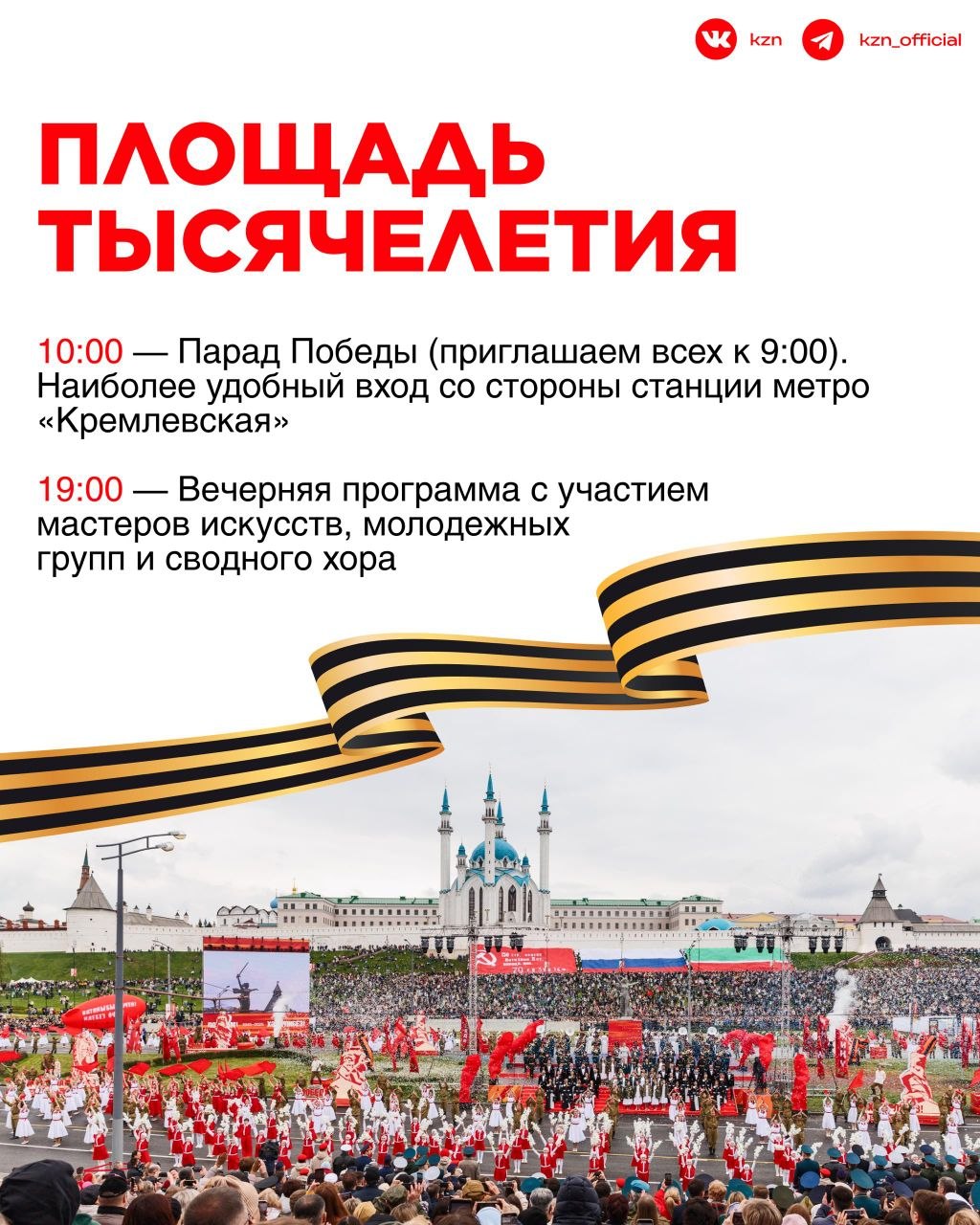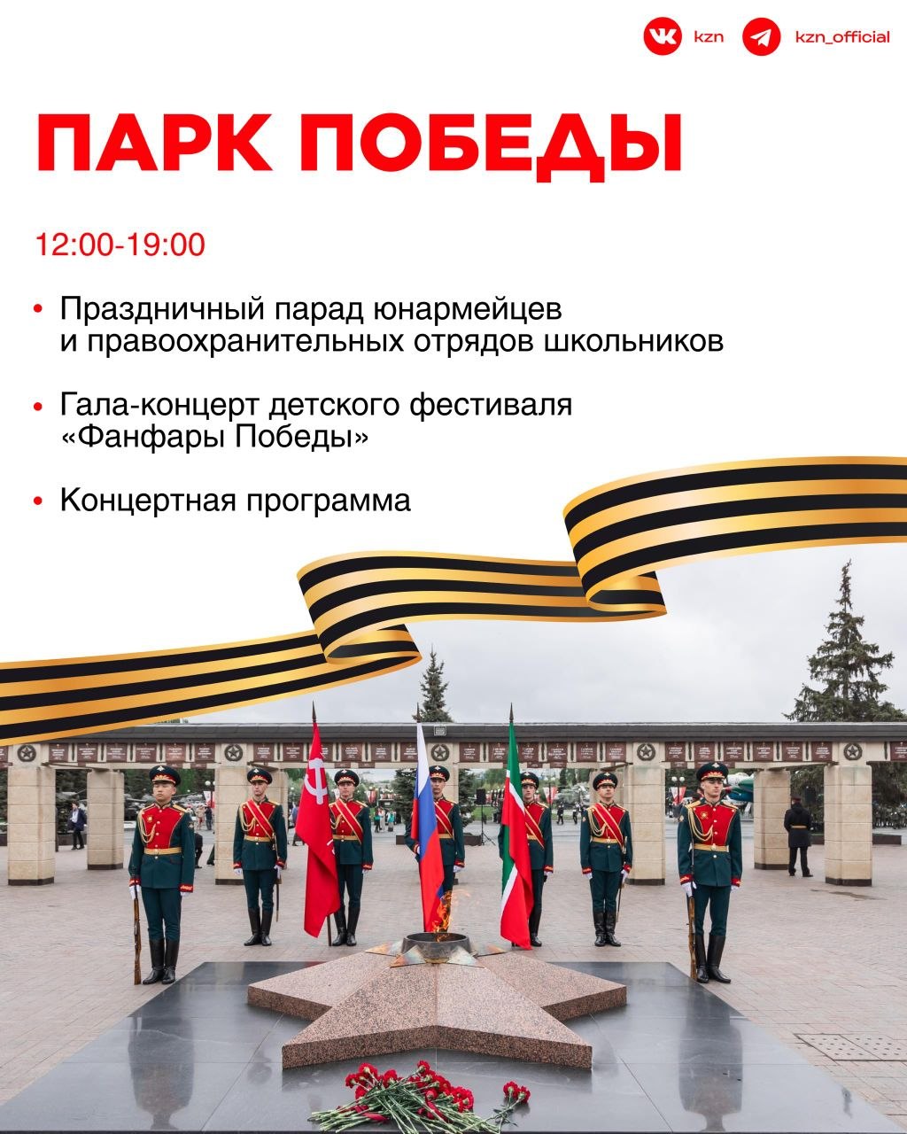 Традиционной площадкой для праздника станет площадь Тысячелетия. Парад начнется в 10 утра, но лучше прийти заранее. В марше примут участие войска Казанского гарнизона, военнослужащие, участники СВО, а также курсанты Военного училища. Парад пройдет и в парке Победы — участие примут старшеклассники, победители конкурса и юнармейцы. Для детей проведут десятки мастер-классов.