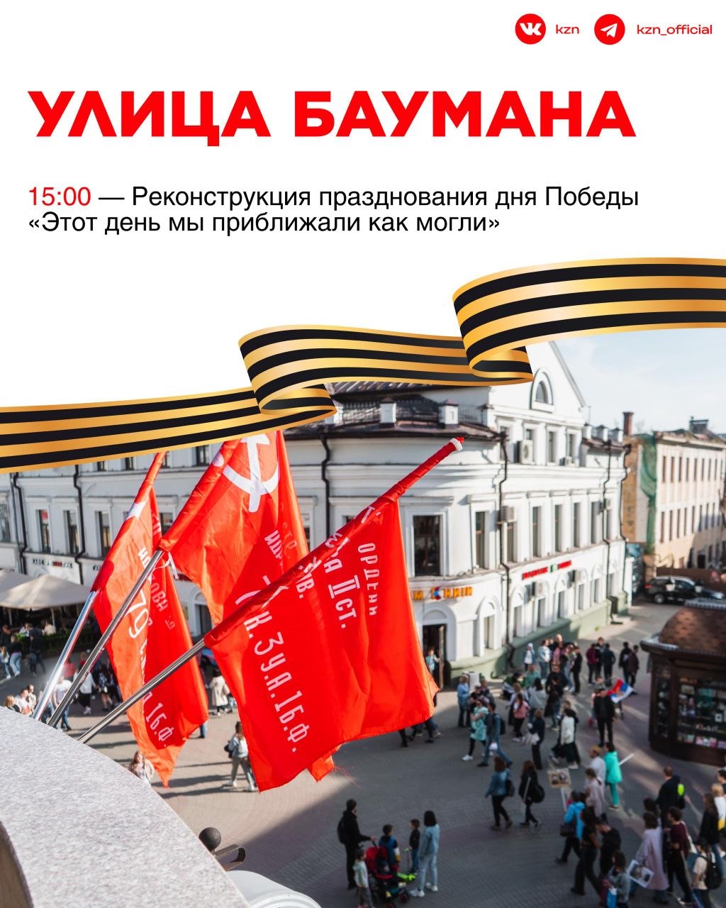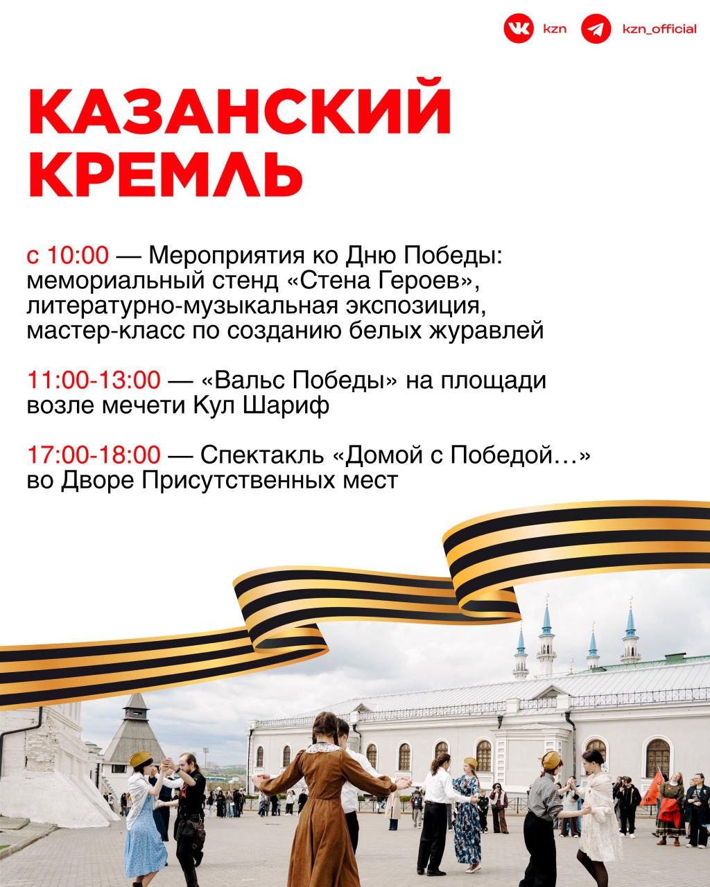 Мероприятия пройдут и на территории Казанского кремля. С 10:00 там запланированы тематические мероприятия, а с 11:00 до 13:00 – акция «Вальс Победы». В пять вечера во дворе Присутственных мест покажут музыкальный спектакль «Домой с Победой…». Иммерсивную программу «Этот день мы приближали как могли» покажут на улице Баумана.