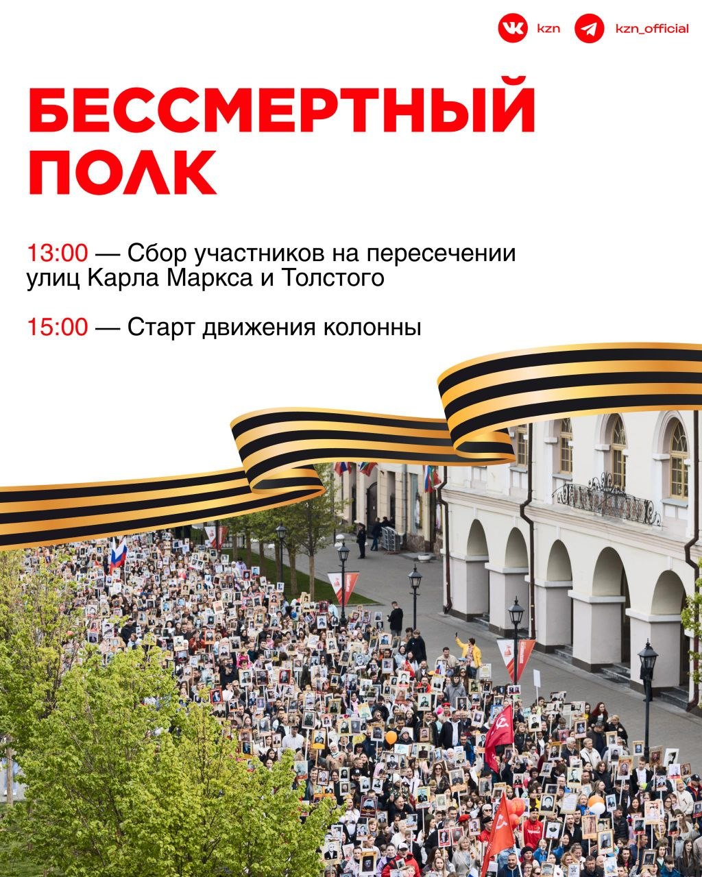 На «Бессмертный полк» зовут к 12:00 – в полдень на пересечении улиц Карла Маркса и Толстого начнет формироваться колонна. Само шествие стартует в 15:00 и пройдет по улицам Карла Маркса, Лобачевского и Кремлёвской, конечная точка – площадь Тысячелетия.