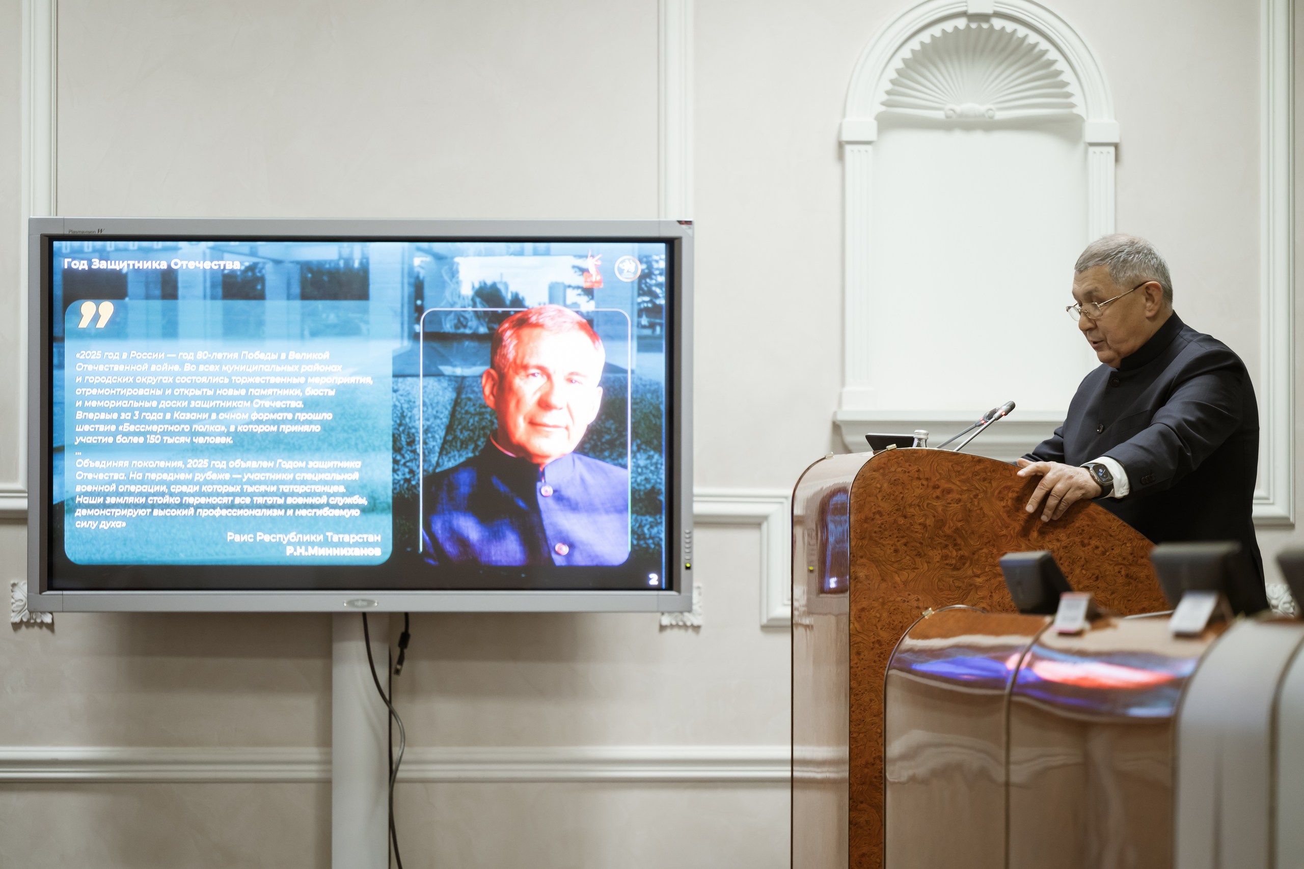 Отдельно обращаюсь к учреждениям культуры, принявшим участие в командировках в зону специальной военной операции для встреч с ее участниками, а также всем тем, кто организовал в 2025 году и будет организовывать мероприятия в 2026 году для бойцов и членов их семей. Прикосновение к прекрасному, к культуре для каждого из них имеет огромное значение. Благодарю министерство культуры и учреждения, работающие в системе культуры, за инициативы и ваш вклад в задачи, которые связаны в отрасли культуры со специальной военной операцией. Отсюда - абсолютно точный, правильный вектор, которому сегодня следует вся страна. Это вектор, связанный с репертуарной политикой, вектор, связанный с тематическими мероприятиями, связанными с патриотическим воспитанием молодого поколения Российской Федерации и Республики Татарстана. Планы, которые мы выстраиваем с вами на 2026 год, должны быть направлены на то, чтобы участники специальной военной операции или члены их семей, которые владеют мастерством слова или могут через культуру донести вот эту правду и информацию, в которой очень нуждаются жители республики Татарстана и Российской Федерации, они должны были задействованы в нашем с вами культурном процессе.