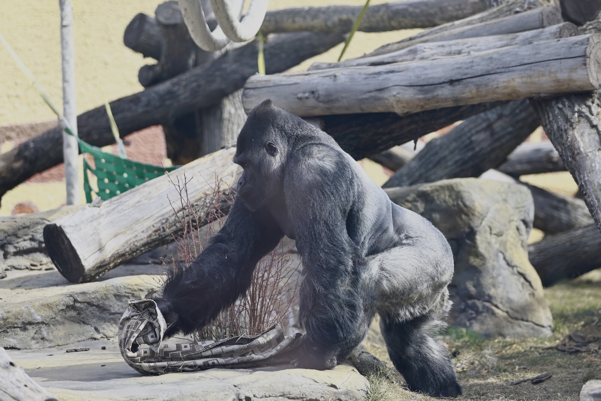Горилла любит кидаться палками и всегда носит с собой плед, а шимпанзе учит братьев ходить на двух ногах