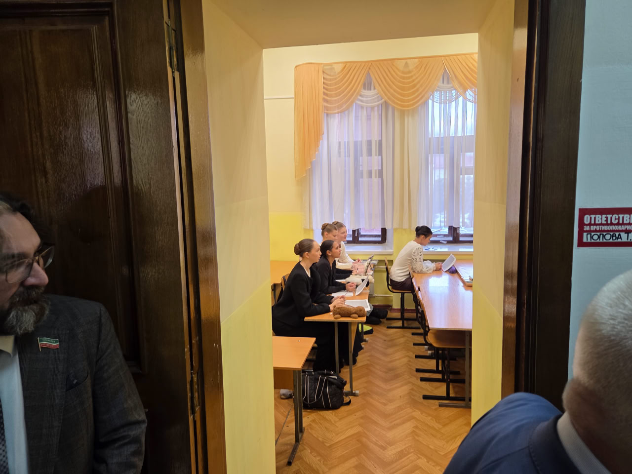 В этот раз совместное заседание Комитета по образованию, культуре, науке и национальным вопросам Госсовета прошло в Казанском хореографическом училище. Директор училища Татьяна Шахнина провела экскурсию, показывая учебные кабинеты и коридоры. Она подробно демонстрировала состояние помещений и их внутреннее убранство, как впоследствии оказалось, не просто так. В одном из небольших залов присутствовавшим рассказали его историю.