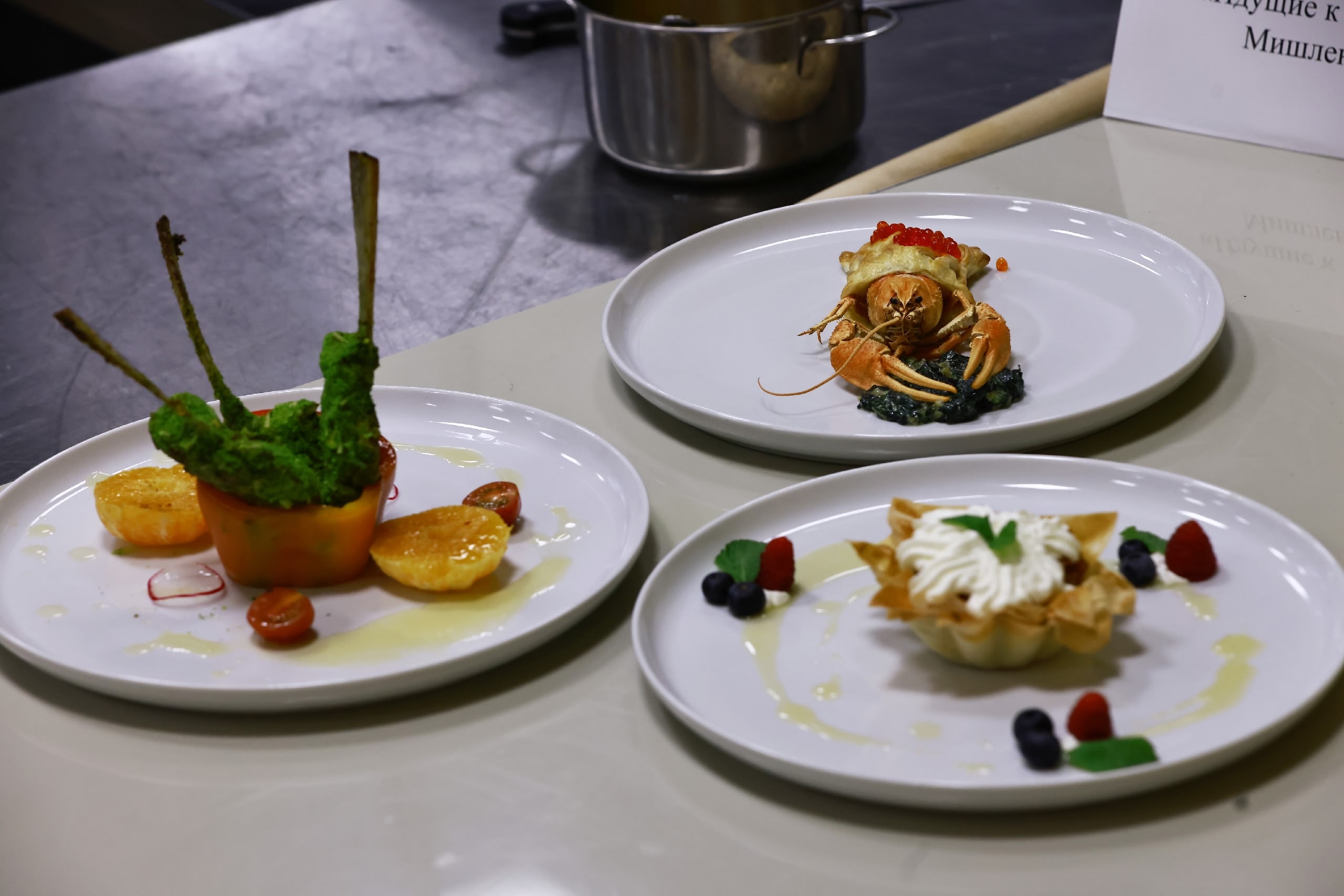 Спустя полтора часа участники представили пельмени с бараниной с копчёной сметаной в соусе из шалфея, морковный кекс с меренгой, компрессированной грушей и малиновым соусом, рийет из форели на ржаном хлебе и многое другое. Как отметил шеф-повар Тимур Мирзаев, студенты делают большие шаги вперед. Не так давно блюда были устаревшими, но теперь «в почерке, и в философии приготовления этих образных блюд прослеживается такая современность, свежесть, даже какие-то тренды».