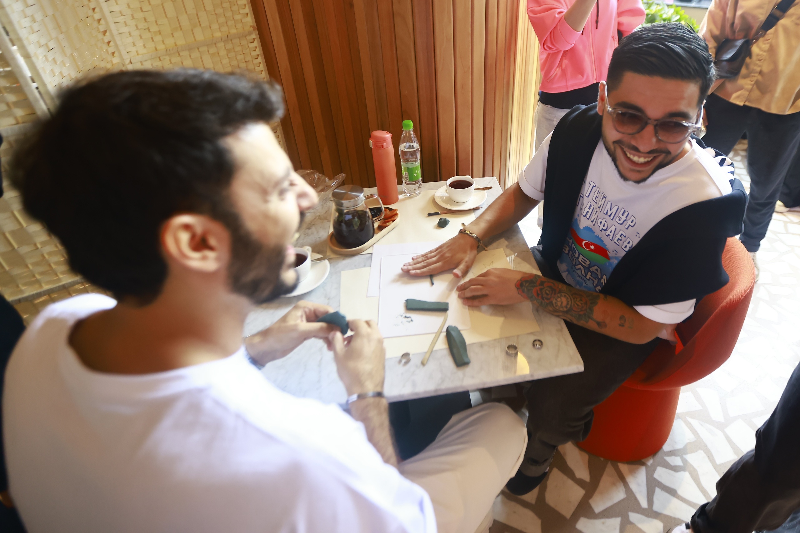 Лепили и правда «все что угодно». Кто-то решил соединить с барельефом свой псевдоним, кто-то - флаг своей страны. Помогали конкурсантам преподаватель Казанского художественного училища имени Фешина Зульфия Мухамедьянова и ее студенты Аделя и Анжела. Они помогали ровнять кривые линии и объясняли, как работать с массой. Интересный факт от Мухамедьяновой - пластилин был любимой игрушкой маленького Виктора Цоя. Это потому, что из него можно сделать любую игрушку. Кто-то отказывался от помощи скульпторов, а кто-то решил полностью отдать лепку в руки профессионалов. Например, российский исполнитель Александр Филин решил сделать из массы филина, SECRET ATELIER придумали лишь слепить название своей группы, а Теймур Ганифаев из Азербайджана старательно лепил звезду.