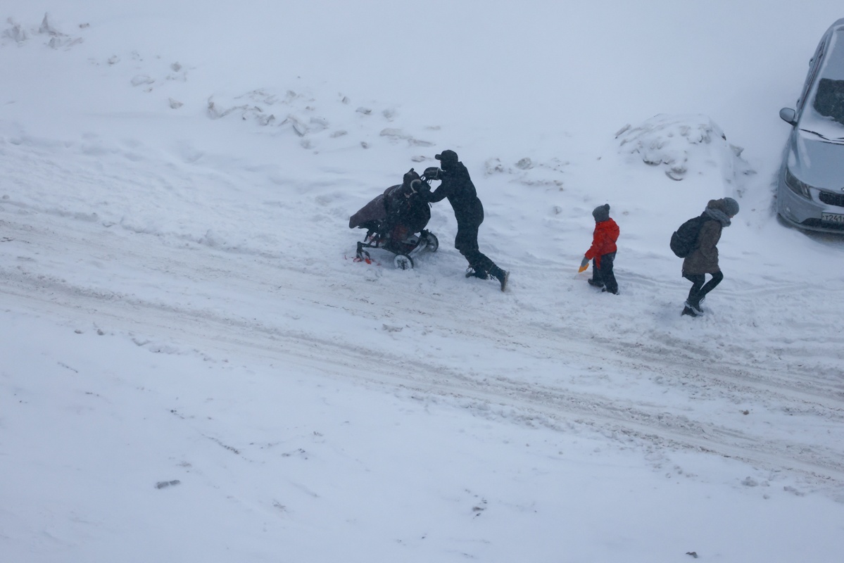 Были и те, кто решался объезжать длинные пробки через трамвайные пути. В итоге одна из машин застряла. Из-за неё встали и трамваи. Не повезло и пешеходам. Сильный ветер и непрекращающийся снегопад явно не располагали к прогулкам.