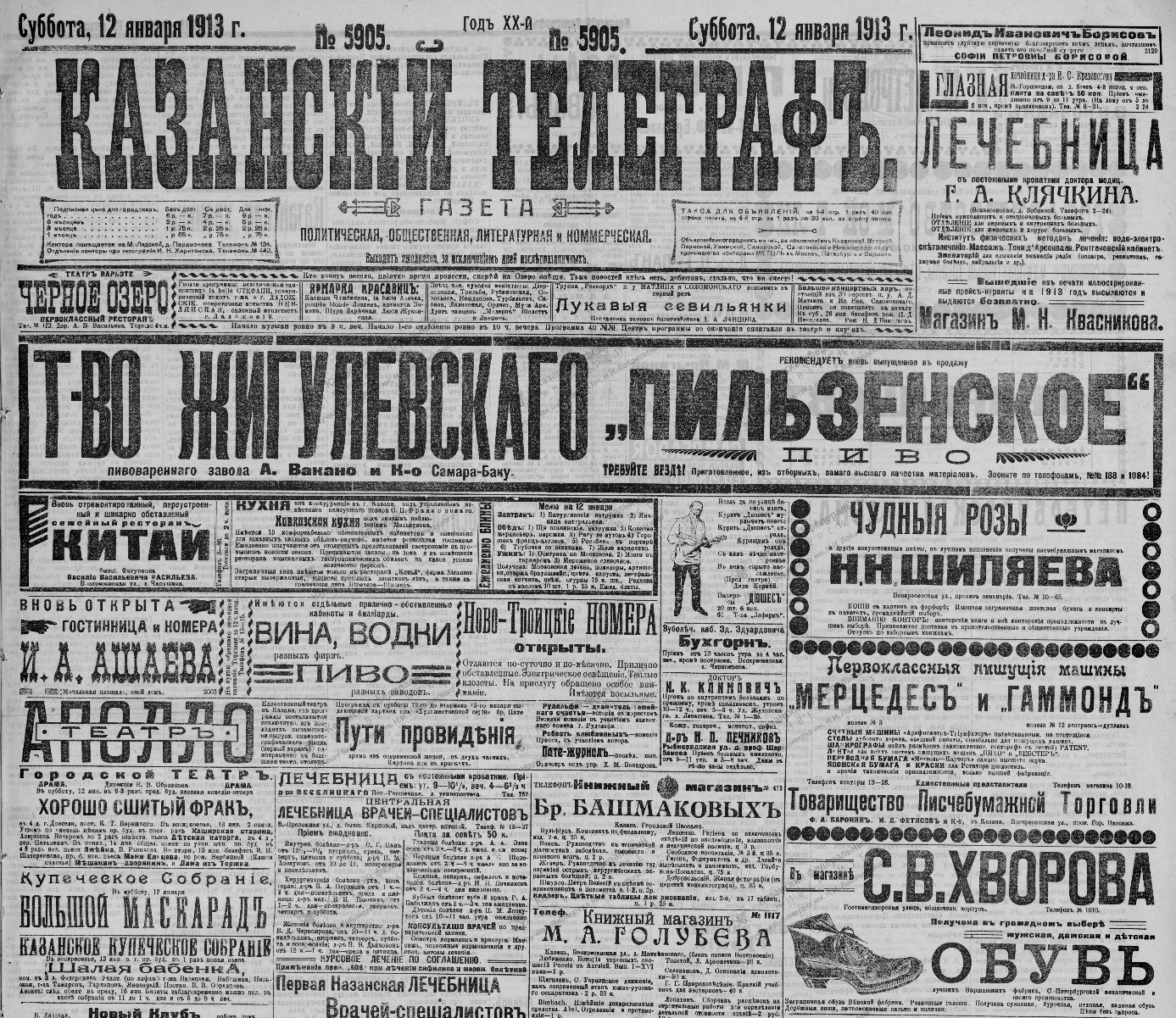 Газета «Казанский телеграф» за 12 января 1913 года (по новому стилю это 25 января, Татьянин день) анонсировала следующие мероприятия: в городском театре пройдет драма «Хорошо сшитый фрак», а в Купеческом собрании состоится большой маскарад. На первой полосе рекламируется пиво «Пильзенское», а также магазин С.В. Хворова, в которой поступила обувь Венской и Варшавской фабрик.