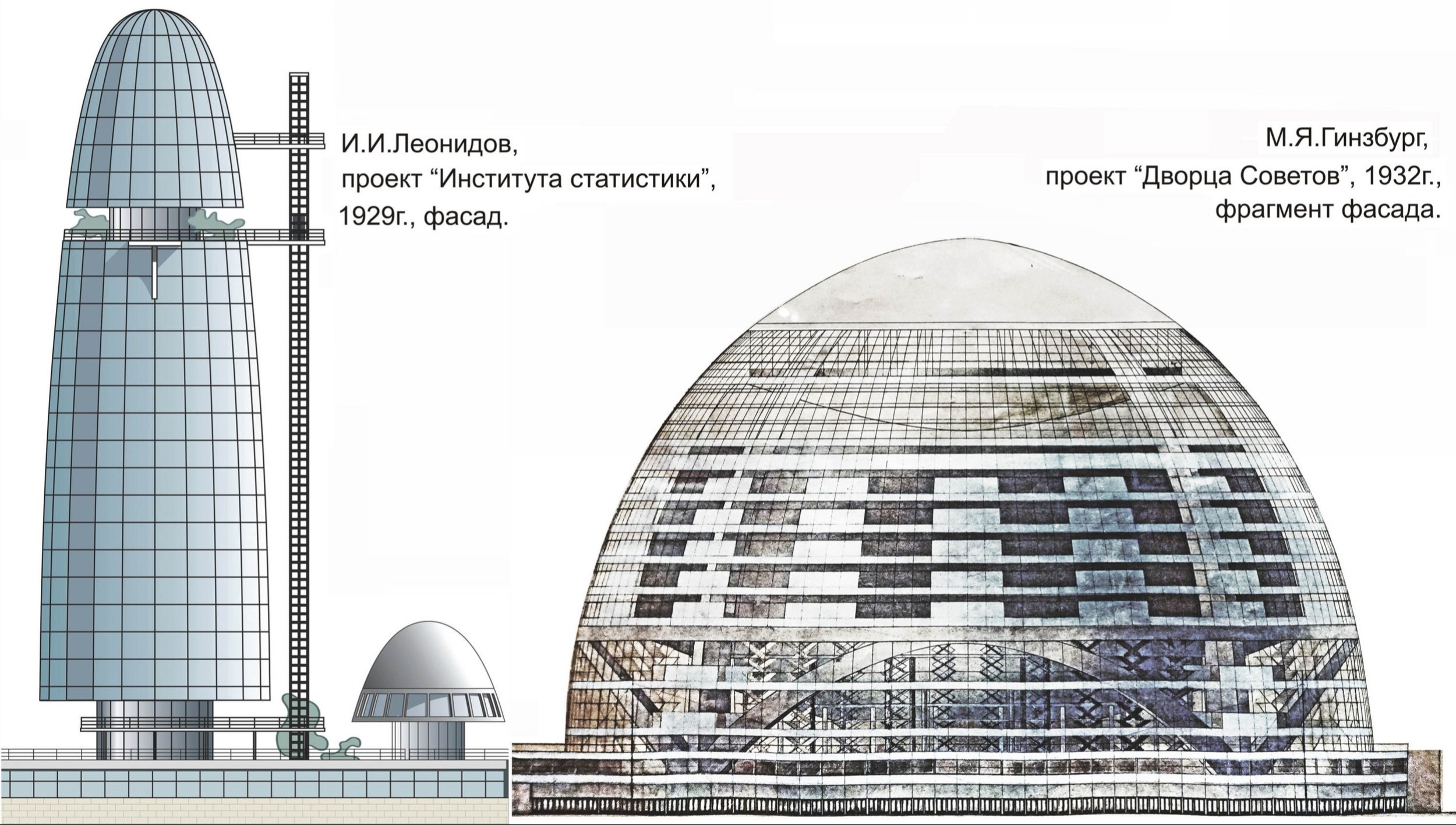 В то время у страны было мало средств на строительство новых зданий, а прорывных идей в головах архитекторов было слишком много. Тогда появилось целое направление так называемых «бумажных архитекторов». Такое название родилось в связи с тем, что их идеи, не будучи реализованными, так и остались только на бумаге. Такими архитекторами были, например, Иван Леонидов и Моисей Гинсбург. Обратите внимание, что в проекте института статистики Ивана Леонидова, датируемого 1929 годом, мы видим сплошное остекление фасадов здания. Если не знать, что этому проекту почти сто лет, то мы бы приняли его за творчество современных нам архитекторов.