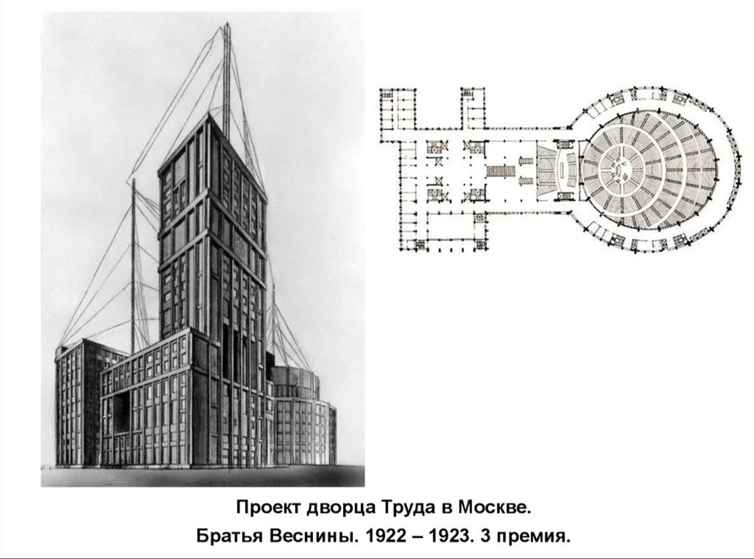 А первым образом небоскрёба в стилистике современной нам архитектуры вполне можно считать конкурсный проект дворца Труда в Москве архитекторов братьев Весниных.