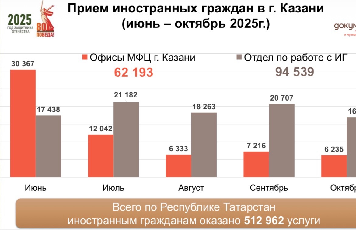 После этого поток разделили: иностранцев начали принимать отдельно. Поток перенаправили в отдельные центры. Например, на Авангардной, 74 принимают только иностранцев. Так, с июня по октябрь офисы казанских МфЦ приняли 61,2 тысячи россиян. За то же время многофункциональный центр посетило 94,5 тысячи иностранных граждан.