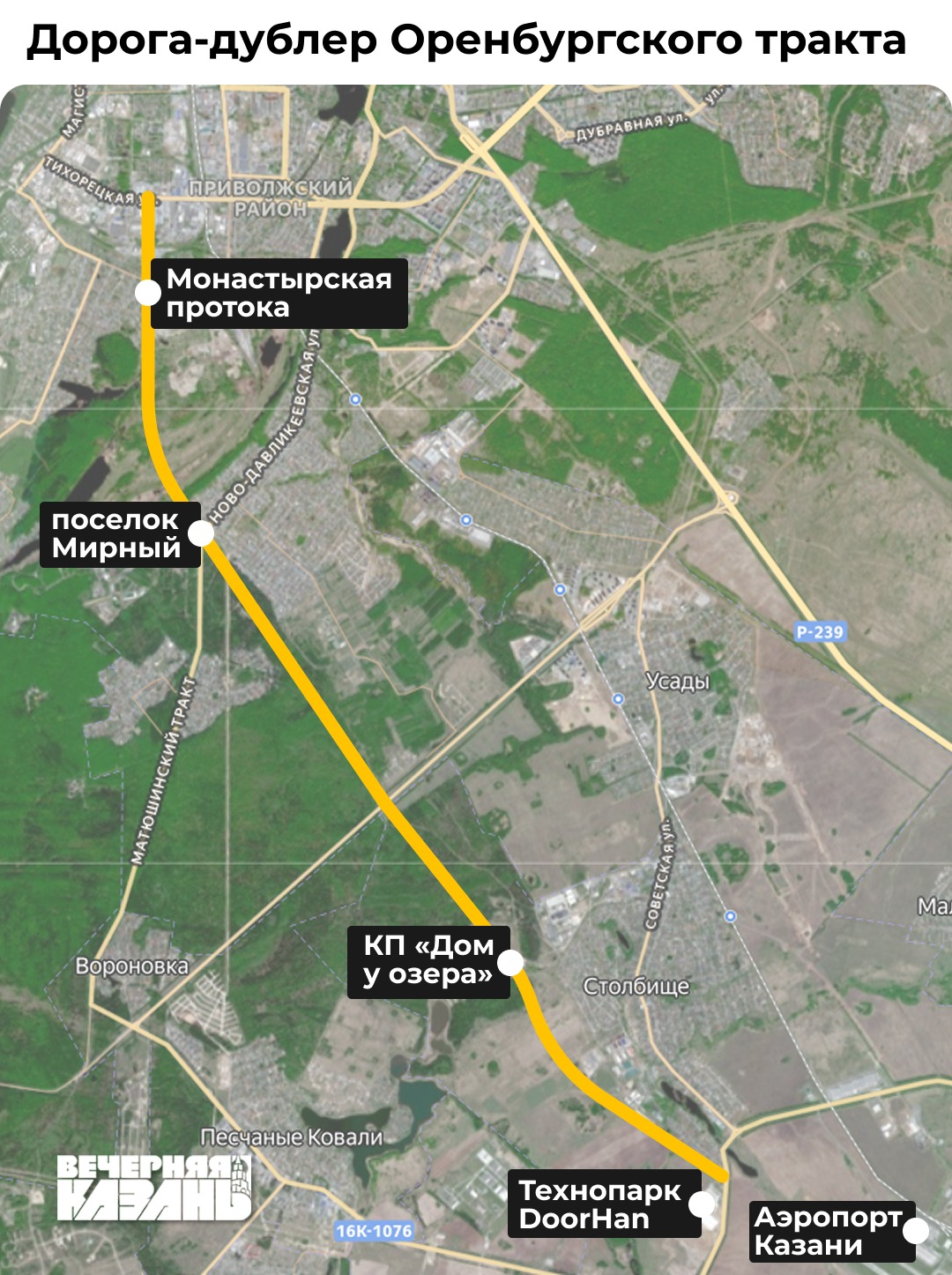 Ранее мы писали, что проектом дороги-дублера Оренбургского тракта не предусмотрен снос жилых домов. Сам проект был одобрен Минэкономразвития РФ - участок протяжённостью 6,7 километра от Лесной Поляны до Столбища признан эффективным. Проект разработан Институтом пространственного планирования Татарстана и учитывает будущее развитие Казанской агломерации в сторону Лаишево. Более половины стоимости строительства может покрыть федеральное софинансирование. Сейчас обсуждается несколько возможных вариантов трассировки новой дороги.