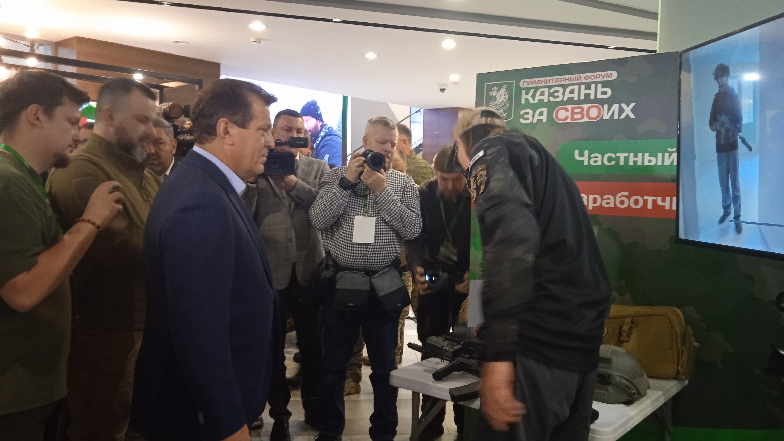 Метшин посмотрел стенды благотворительных движений и проектов, а также узнал о планах производства нового оружия и глушилок. Все изобретения градоначальник подержал в руках, например, дроны, плетеные сети и аксессуары ручной работы. К концу осмотра у мэра собралась целая стопка подарков от гуманитарщиков.