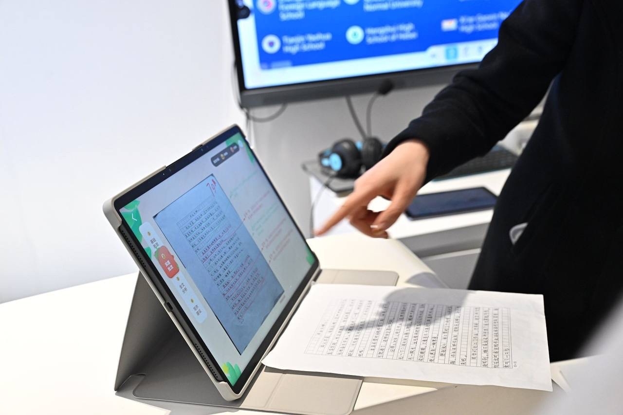 Минниханову презентовали наушник с функцией синхронного перевода, в памяти которого загружено 80 языков. Гостю также показали систему проверки учебных материалов — искусственный интеллект проанализировал тест школьника на основе загруженных данных.