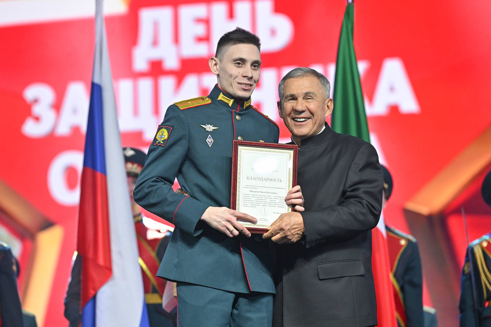 Торжество началось с выноса флагов и гимнов. В своей речи раис напомнил, что год назад здесь же дали старт Году защитника Отечества. А 2026-й в Татарстане объявлен Годом воинской и трудовой доблести.