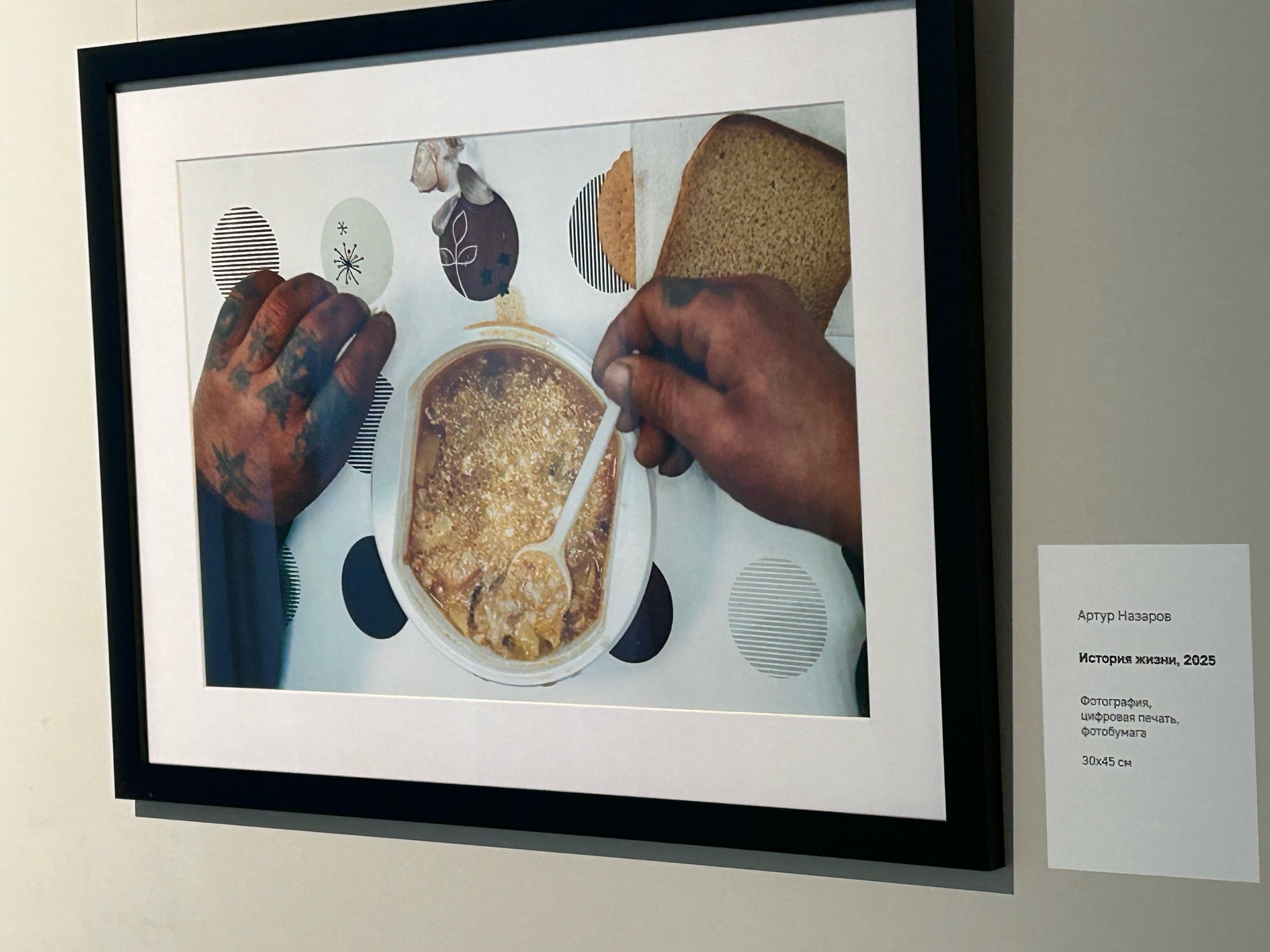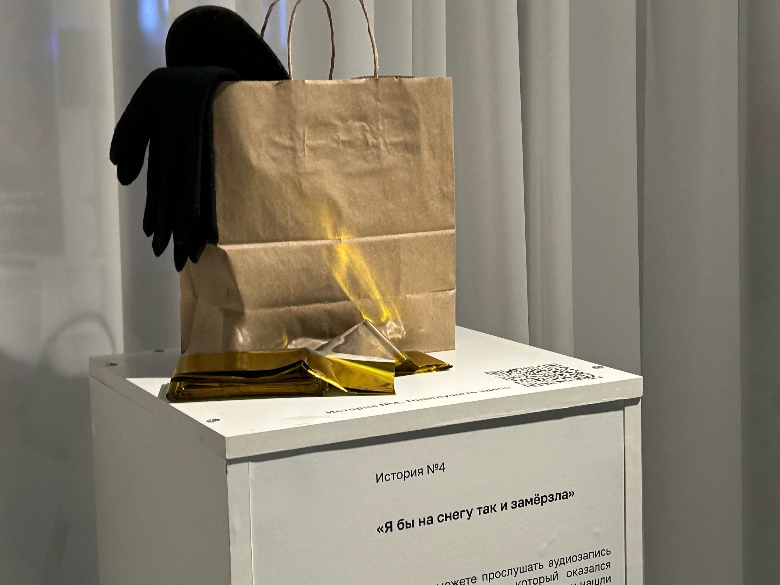 Среди работ есть и инсталляции: пластиковые чашки с одноразовой заваркой, нарезанный хлеб, плед. Каждая работа сопровождается историей человека, который оказался в трудной жизненной ситуации. Их можно прослушать, перейдя по кьюар-коду.