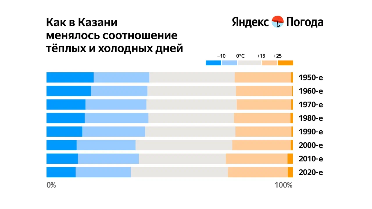 Количество холодных дней снижается в Казани с каждым годом, а число теплых растет. Об этом говорится в исследовании «Яндекс Погоды», где изучили исторические данные сервиса.