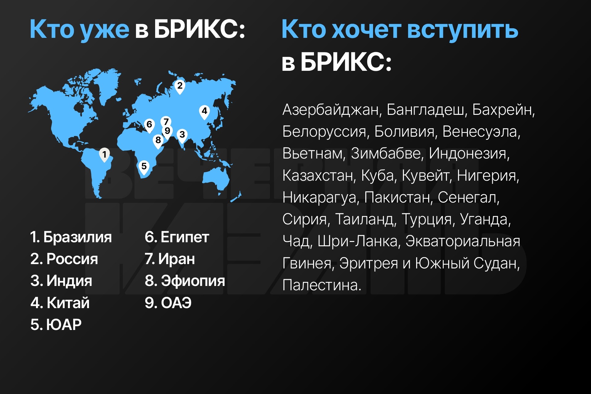 С 2011 года в состав объединения входили Бразилия, Россия, Индия, Китай и Южная Африка. С января 2024 года к составу присоединились ОАЭ, Иран, Египет, Саудовская Аравия и Эфиопия. Казанский саммит — первый, который пройдет в расширенном составе.