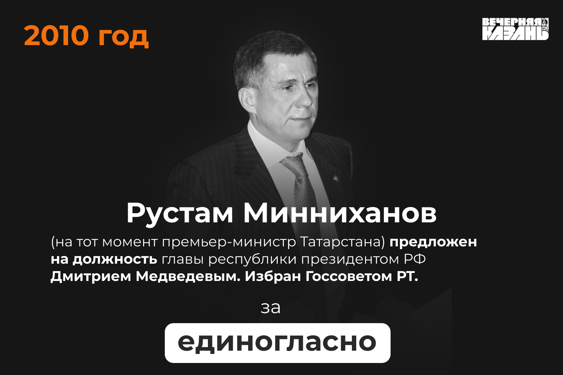 После этого уже сам Медведев 27 марта 2010 года предложил Минниханова депутатам Государственного совета Татарстана, а 4 февраля парламент единогласно утвердил его на должность президента республики на пять лет.