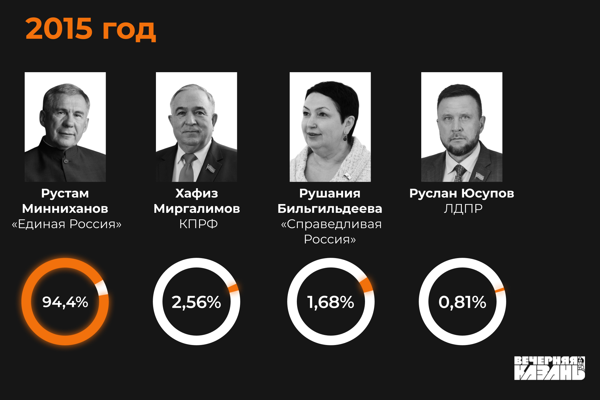 В этом году за пост главы региона конкурируют четыре кандидата: Минниханов от «Единой России», Миргалимов от КПРФ, затем пенсионер Виталий Смирнов, являющийся председателем отделения РППС, и координатор отделения ЛДПР, заместитель директора ООО «Байлык № 3» Руслан Юсупов.