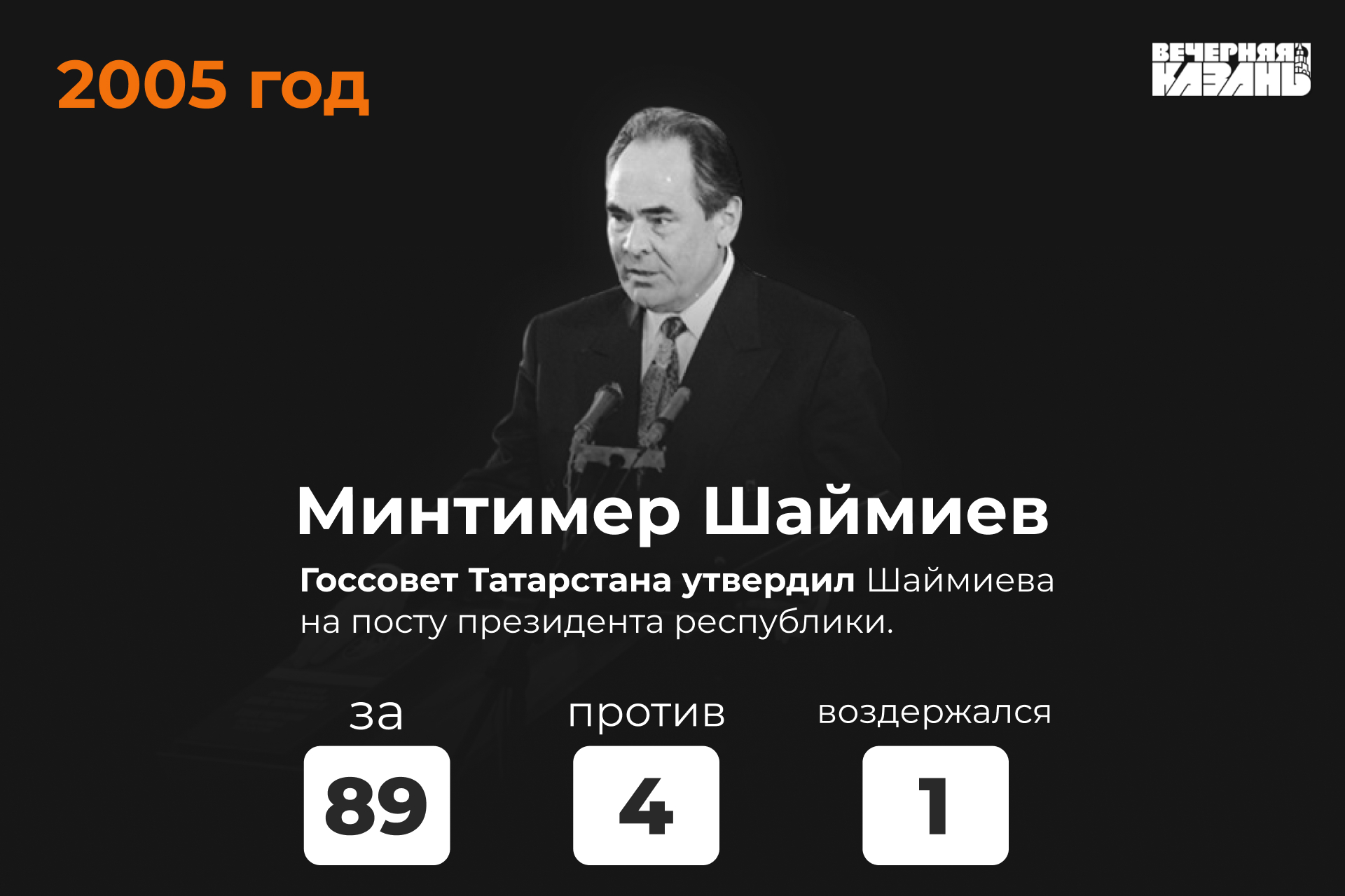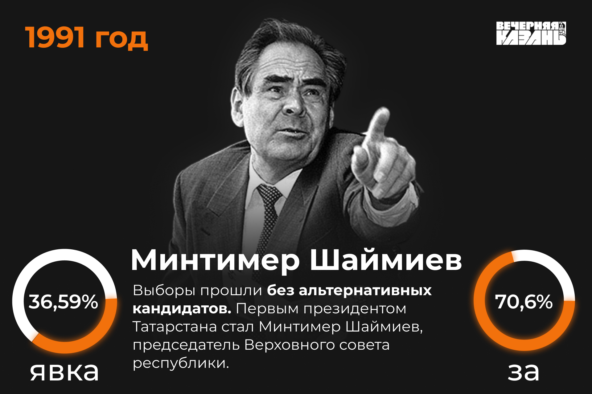 Должность президента Татарстана была учреждена лишь в 1991 году, когда в Конституцию Татарской ССР внесли соответствующие изменения. А сами первые выборы президента республики прошли 12 июня того же года и были безальтернативными: другие кандидаты отказались участвовать. Президентом Татарстана стал председатель Верховного совета республики Минтимер Шаймиев, за которого проголосовали 70,6 процента избирателей, а явка составила 36,59 процента. А Василий Лихачёв стал первым и единственным в истории республики вице-президентом.