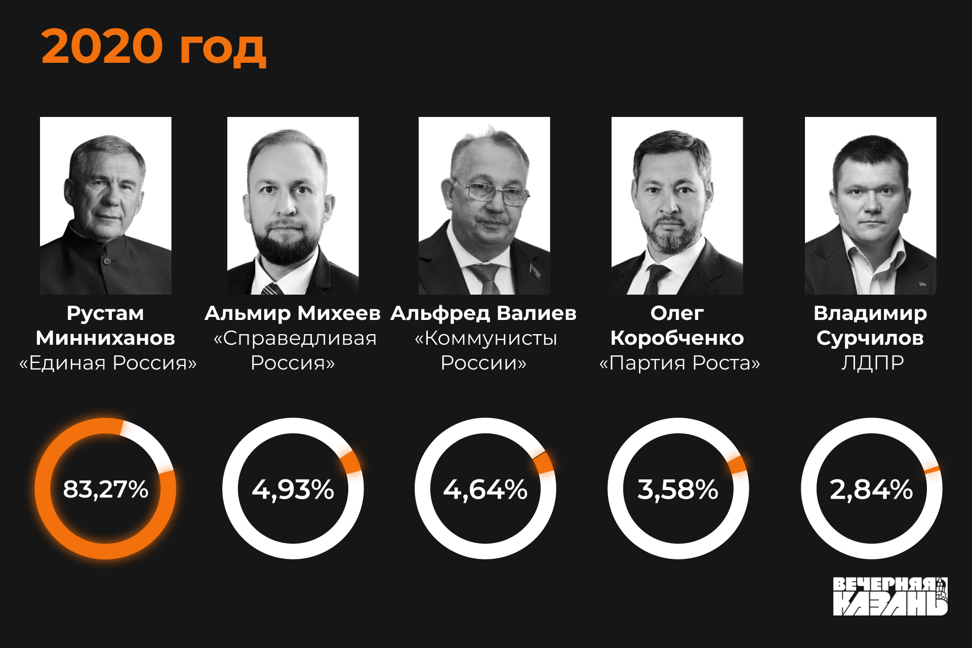 На выборах 2020 года, как оказалось, республиканского президента выбирали в последний раз. Конкуренцию Минниханову составили занимавший пост директора управляющей компании «Уныш» Альфред Валиев от «Коммунистов России», депутат Госсовета и бизнесмен Олег Коробченко от «Партии Роста», предприниматель и депутат республиканского парламента Альмир Михеев, а также депутат Нармонского сельского поселения Владимир Сурчилов от ЛДПР. Представители КПРФ на тех выборах решили не выставлять кандидата: руководитель татарстанских коммунистов Хафиз Миргалимов заявил тогда, что действующий глава республики обладает высоким авторитетом у населения и поэтому у него нет конкурентов.