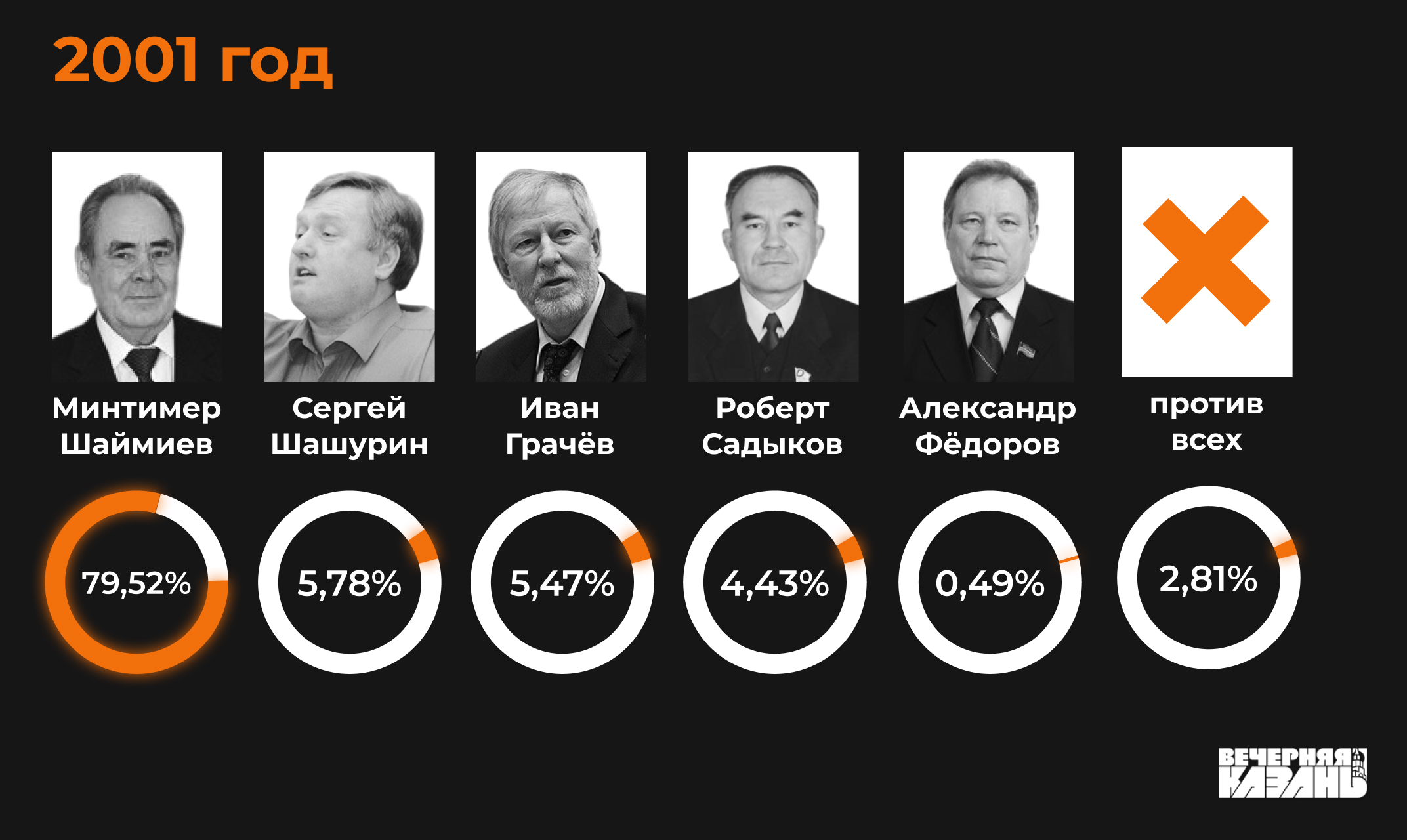 Зато следующие выборы 2001 года наконец были альтернативными, жители республики могли выбрать среди пятерых кандидатов. Победу и в этот раз одержал Шаймиев: за него отдали свои голоса 79,52 процента избирателей. На втором месте оказался тогда еще депутат Госдумы, бизнесмен Сергей Шашурин с 5,78 процента голосов, еще один депутат Госдумы Иван Грачёв набрал 5,47 процента, первый секретарь Компартии Татарстана Роберт Садыков — 4,43 процента и первый замглавы администрации Зеленодольского района Александр Фёдоров — 0,49 процента. В тот год против всех кандидатов проголосовали 2,81 процента избирателей, а явка составила 79,37 процента.