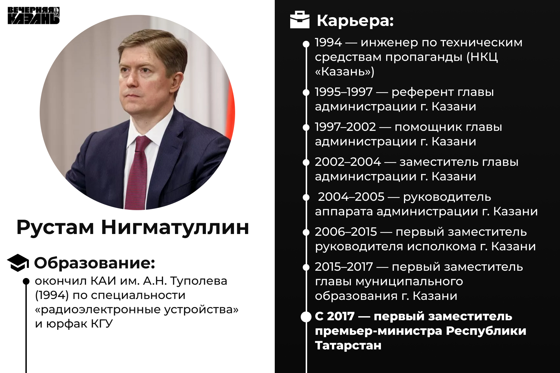Песошин сохранил почти всех своих заместителей. Так, первым заместителем премьер-министра Татарстана остался Рустам Нигматуллин. Он курирует вопросы организации защиты республики от атак беспилотников, реализации крупных инфраструктурных проектов в таких сферах, как транспорт и жилищное строительство. Решение о его назначении было принято единогласно.