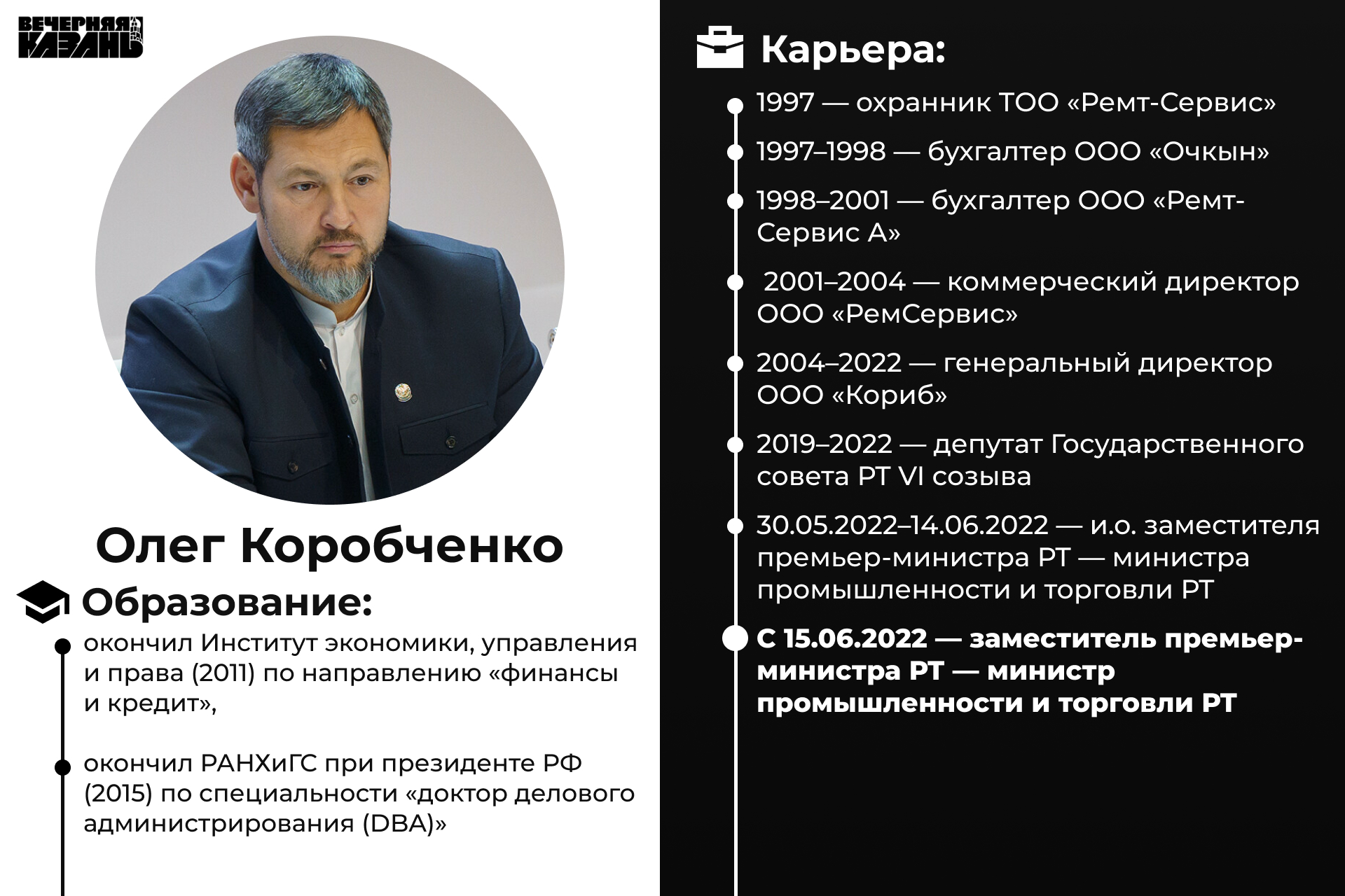 Была отмечена работа Олега Коробченко, которого снова выдвинули на должность заместителя премьер-министра Татарстана - министра промышленности и торговли. Он выстроил хорошие связи с федеральными министерствами, что привнесло в бюджет 110 миллиардов рублей, говорил премьер.