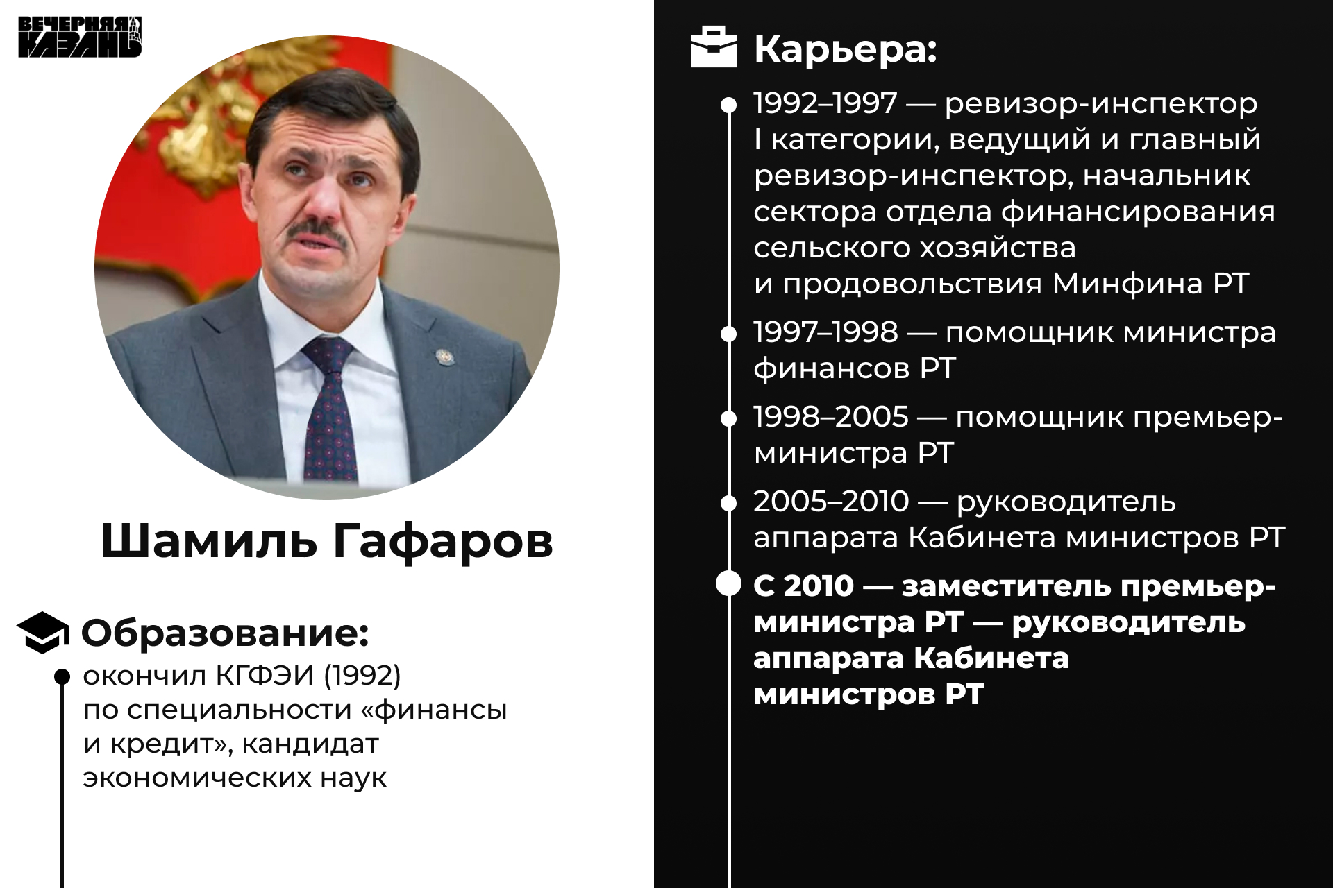 Премьер также внес на рассмотрение кандидатуру Шамиля Гафарова, руководителя аппарата Кабинета министров Татарстана. Благодаря ему была выстроена стройная система взаимодействия и установлены деловые связи с федеральными органами, хвалил подчинённого Песошин. Также Гафаров работал по подготовке и проведению крупных мероприятий, проведенных в столице Татарстана.