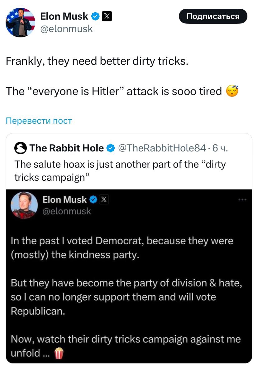 К сообщению Маск прикрепил пост трехлетней давности, где заявлял, что голосует за республиканцев и что демократическая партия устроит против него кампанию с грязными приёмами.