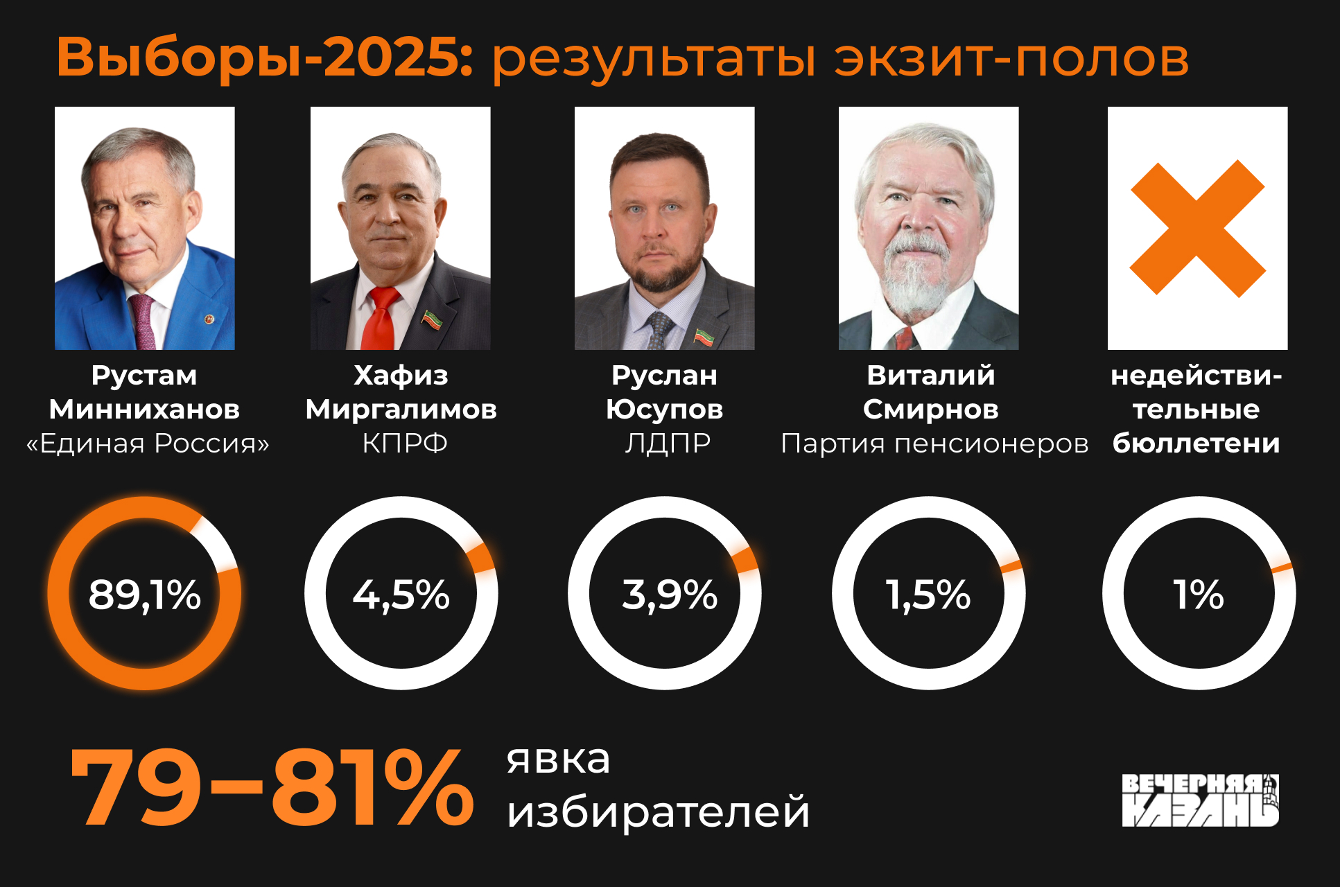 Напомним, по данным экзит-полов Рустам Минниханов также одерживал уверенную победу. В опросе жителей республики он набрал 89,1 процента голосов.
