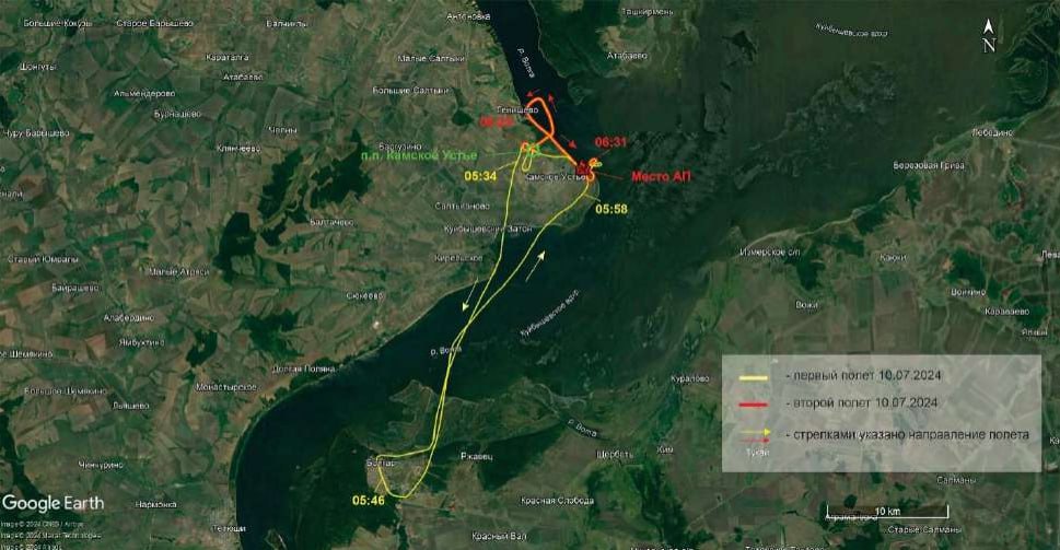 10 июля 2024 года, аэродром Куралово, 5 утра. Пилот Евгений Гущин готовится к вылету, заправляет самолет Cessna С-172-0381, пускает на борт несколько пассажиров и вылетает по маршруту до Болгар и обратно. Полет проходит в штатном режиме на высоте 850 метров. В 6 утра борт возвращается и спустя 23 минуты вылетает снова. На заднем диване расположились мама с 11-летней дочкой, а на переднем — отец, прибывшие на экскурсию из Москвы.