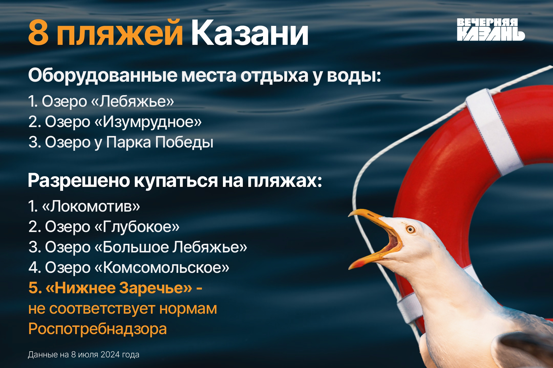 Пляжный сезон в столице Татарстана стартовал 1 июня – власти города открыли пять пляжей и три площадки отдыха у воды. Вдоль береговой линии разрешенных для купания площадок очистили дно, провели водолазное обследование, а также взяли пробу воды и песка. Разрешенная для купания зона также оборудована теневыми навесами, буями, скамейками, урнами и раздевалками.