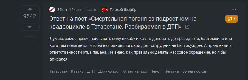 После нашей публикации в соцсетях началось активное обсуждение трагедии, случившейся на 20-м километре автодороги Казань – Оренбург – Боровое Матюшино. Пользователи «Пикабу», например, предлагают написать коллективное обращение на имя президента страны или главы СКР, чтобы сотрудника ГИБДД не привлекали к ответственности. С предложением согласились почти 10 тысяч человек.