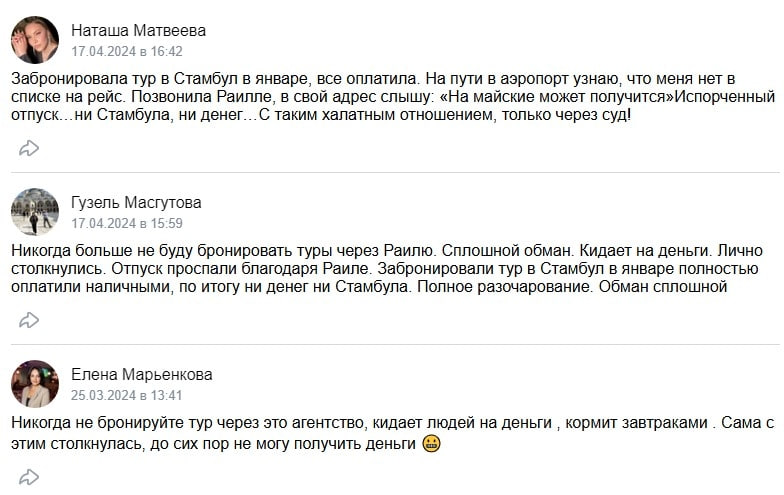 С первыми проблемами клиенты агентства INDRIYA столкнулись уже в марте 2024 года. Однако Альмеева не прекратила продажи и продолжила принимать предоплату за туры вплоть до октября. Люди даже создавали тематические группы в социальных сетях, чтобы предостеречь доверчивых граждан. Однако на уловки попадались в течение полугода.