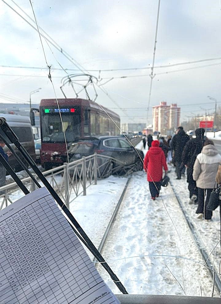 На участке Ямашева — Гаврилова трамвай наехал на автомобиль. Водитель захотел объехать пробку по трамвайным путям и попал прямо под движущийся транспорт. Пострадавших нет, сообщили в МУП «Метроэлектротранс».